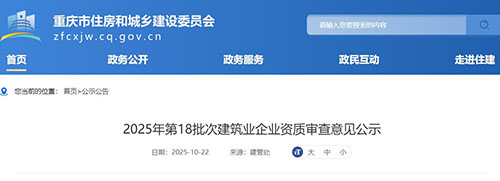 近日,重庆市住建委官网发布了关于2025年第18批次建筑业企业资质审查意见的公示。 2025年第18批次建筑业企业资质审查意见公示 按照《行政许可法》《建筑业企业资质管理规定》(住房城乡建设部令第22号)、《住房城乡建设部关于印发〈建筑业企业资质标准〉的通知》(建市〔2014〕159号)、《住房城乡建设部关于印发〈建筑业企业资质管理规定和资质标准实施意见〉的通知》(建市〔2015〕20号)规定,经企业申报和征求区县住房城乡建设主管部门意见,我委近期审查了重庆天舟建筑有限公司等企业申请建筑业企业资质的材料,并进行了集体会审,现将审查意见予以公示。公示期为2025年10月22日至2025年10月31日。审查意见为不同意的企业,自公示之日起2天后可通过“重庆建设工程信息网→网上申报→行政审批服务中心信息管理平台”查询具体意见。 公示期内,任何单位及个人均可对公示企业申请材料的真实性进行举报,单位举报应加盖公章,个人举报应署真实姓名和联系电话,举报应附详细证明,以便核查。 公示期内,如企业对申报的人员、设备和业绩情况的审查意见有异议的,可以于2025年10月31日24时前,通过行政审批服务中心信息管理平台提交陈述申请,我委不再受理书面陈述材料(涉及专业部门资质的陈述,仍需提交书面资料至1楼大厅综合窗口)。超过公示截止日期的不予受理。陈述材料只能对申请材料进行解释和说明,不得增加新的人员、设备和业绩等材料。陈述材料有弄虚作假的,将依法予以处理。 联系地址:渝中区长江一路58号1楼市工程建设政务服务中心 邮 编:400014 联系电话:023-63672117 附件:2025年第18批次建筑业企业公示意见表
