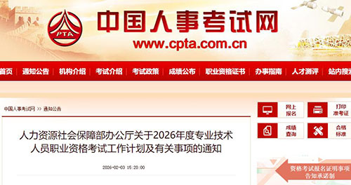 近日,人社部官网发布了《人力资源社会保障部办公厅关于2026年度专业技术人员职业资格考试工作计划及有关事项的通知》。